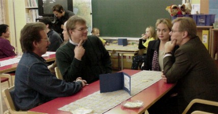Matti Koivuporras tarjoilee opettaja Sirpa Kinnarille, YLE:n toimittaja Elina