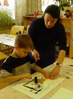 Aluksi askarreltiin painolaatta, johon telattiin painoväriä ja tehtiin